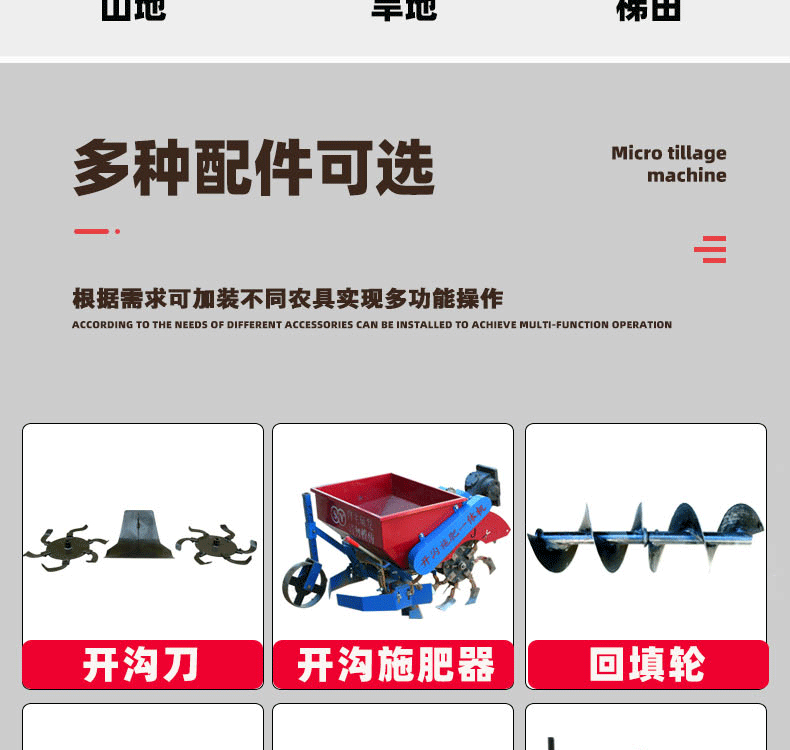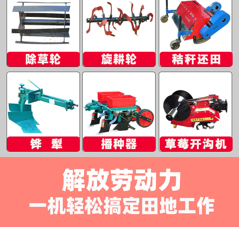 8,一机多用,更换相应配件即可实现开沟,旋耕,起垄,除草,回填,喷洒等功能。